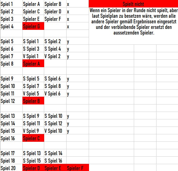 - Es ist eine einzige Liste erlaubt, welche während des gesamten Turniers gespielt werden muss